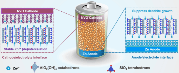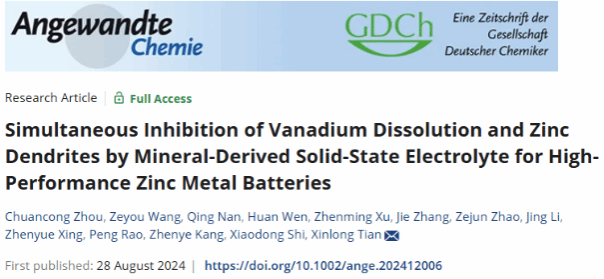 近日,海洋科学与工程学院史晓东副教授所在团队在能源化学领域顶级期刊Angewandte Chemie International Edition (IF=16.1)发表题为“Simultaneous Inhibition of Vanadium Dissolution and Zinc Dendrites by Mineral-Derived Solid-State Electrolyte for High-Performance Zinc Metal Batteries”的研究论文。周传聪博士为论文第一作者,史晓东副教授和田新龙教授为论文通讯作者,必赢76net线路官网海洋科学与工程学院为论文唯一通讯单位。