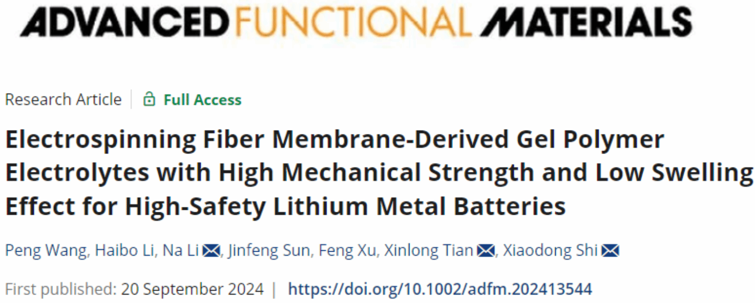 近日,海洋科学与工程学院史晓东副教授所在团队在能源化学领域顶级期刊Advanced Functional Materials发表题为“Electrospinning Fiber Membrane-Derived Gel Polymer Electrolytes with High Mechanical Strength and Low Swelling Effect for High-Safety Lithium Metal Batteries”的研究论文。河北科技大学王鹏副教授为论文第一作者,必赢76net线路官网史晓东副教授和田新龙教授为论文通讯作者。