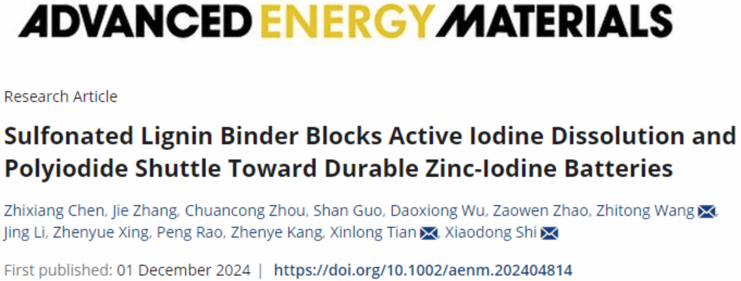 12月1日,史晓东副教授所在团队在能源领域顶级期刊Advanced Energy Materials发表题为“Sulfonated Lignin Binder Blocks Active Iodine Dissolution and Polyiodide Shuttle toward Durable Zinc-Iodine Batteries”的研究论文。必赢76net线路官网研究生陈志祥(研二)、张杰(研三)和周传聪博士(博四)为论文共同第一作者,史晓东副教授、王志同副教授和田新龙教授为论文共同通讯作者。