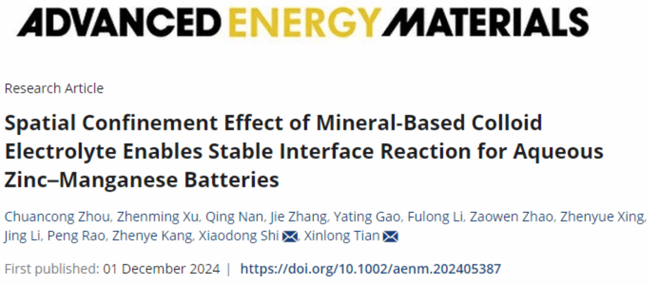 12月1日,海洋科学与工程学院史晓东副教授所在团队在能源领域顶级期刊Advanced Energy Materials发表题为“Spatial Confinement Effect of Mineral-based Colloid Electrolyte Enables Stable Interface Reaction for Aqueous Zinc-Manganese Batteries”的研究论文。必赢76net线路官网2021级博士研究生周传聪为论文第一作者,史晓东副教授和田新龙教授为论文共同通讯作者。